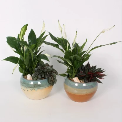 Die ausdrucksstarke Blüte der Anthurie (Anthurium andreanum) lenkt die Blicke auf sich und der Zwergpfeffer (Peperomia) bildet den eleganten Rahmen für dieses dekorative Arrangement in einer hübsch glasierten Kugelkeramik.