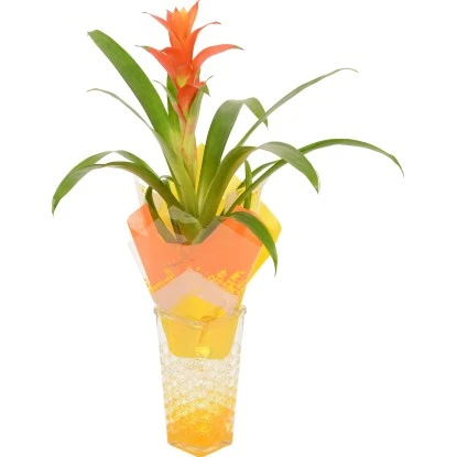 Die Bromelie (Bromelia) ist ursprünglich in Südamerika beheimatet und besticht durch ihre sehr dekorativen Blütenstände in leuchtenden Farben. Das Arrangement ist mit Gelbällen befüllt und somit sehr farbenfroh und frisch. Durch die Dekoration mit farbigem Deko-Tuch passend zur Blütenfarbe findet eine richtige Farbexplosion statt. So holen Sie sich den Sommer ins Haus.