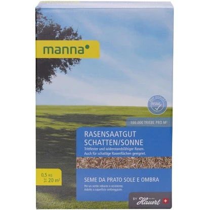 Der Manna Saat Sonnen- und Schattenrasen ist geeignet für sattgrünen Rasen in schattigen Lagen, der auch Sonne verträgt. Der Rasen wird dicht, belastbar und setzt sich auch gegen Moos durch.