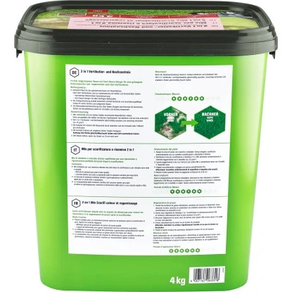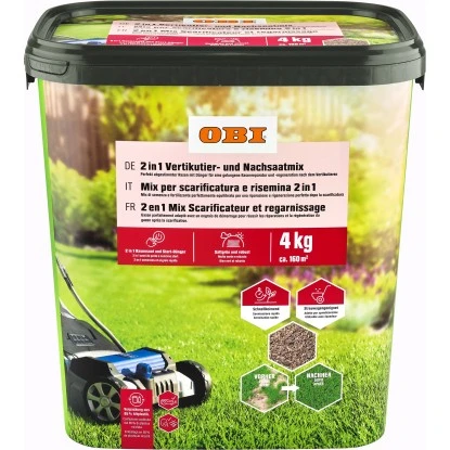 Der OBI Living Garden 2 in 1 Vertikutier- und Nachsaatmix sorgt mit Start-Rasendünger für eine gelungene Rasenreparatur und -regeneration nach dem Vertikutieren. Das Komplett-Paket für die optimale Nachsaat von Rasenflächen nach dem Vertikutieren und zur Ausbesserung von kahlen und lückenhaften Stellen besteht aus einer hochwertigen Rasensamen-Spezialmischung (2 kg) und einem Start-Rasendünger mit allen wichtigen Nährstoffen (2 kg). Die Saatgutmischung enthält besonders schnell keimende und durchsetzungsfähige Gräser für einen dichten und saatgrünen Rasen. Die Nährstoffzusammensetzung des Start-Rasendüngers beschleunigt die Keimphase, fördert die Wurzelbildung sowie ein schnelles und dichtes Anwachsen.
