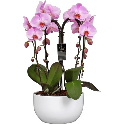 Die Schmetterlingsorchidee (Phalaenopsis) ist die bekannteste und beliebteste aller Orchideenarten. Ihren Namen verdankt sie der besonderen Blütenform, die an tropische Schmetterlinge erinnert. Schmetterlingsorchideen sind besonders blühfreudig und robust und eignen sich auch ideal für ungeübte Orchideenliebhaber. Sie kommen mit normalen Wohnzimmertemperaturen sehr gut zurecht und bevorzugen dabei einen hellen bis halbschattigen Fensterplatz, ohne direkte Mittagssonne. An heißen Tagen und bei trockener Heizungsluft sollten die Luftwurzeln morgens leicht mit etwas Wasser besprüht werden. Im Sommer wöchentlich, im Winter alle zwei Wochen gießen oder tauchen. Je wärmer und heller die Orchideen stehen, desto mehr Wasser benötigen sie. Staunässe vermeiden und regelmäßig alle vier Wochen mit handelsüblichem Orchideendünger in schwacher Konzentration düngen.